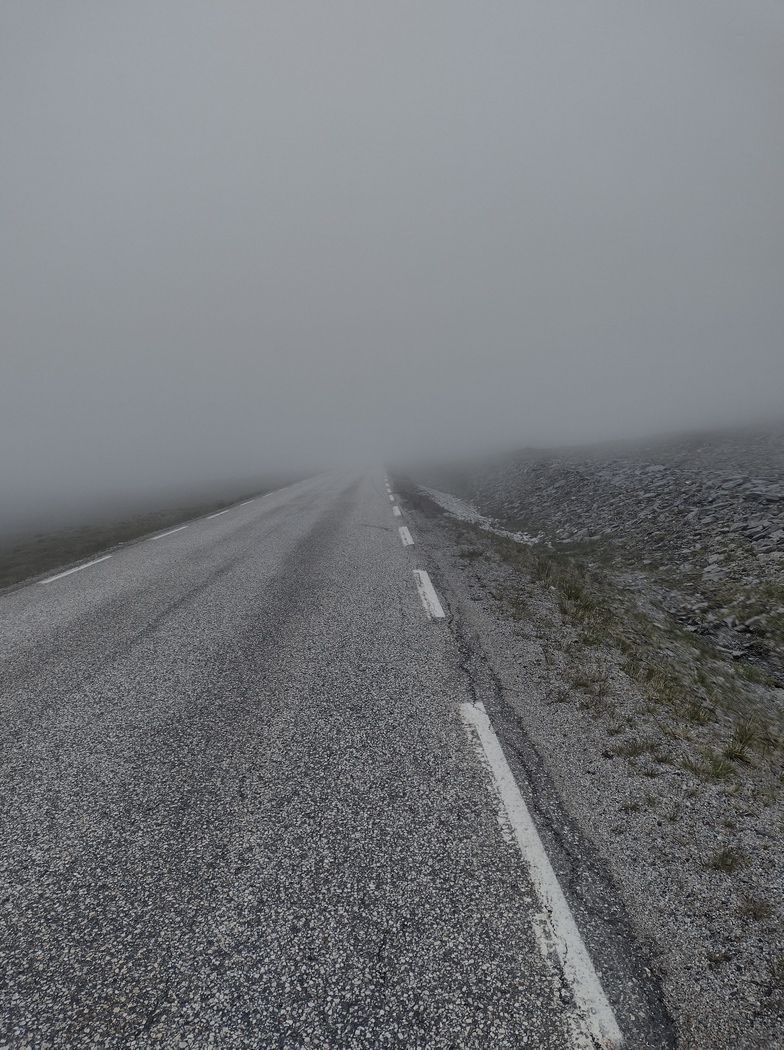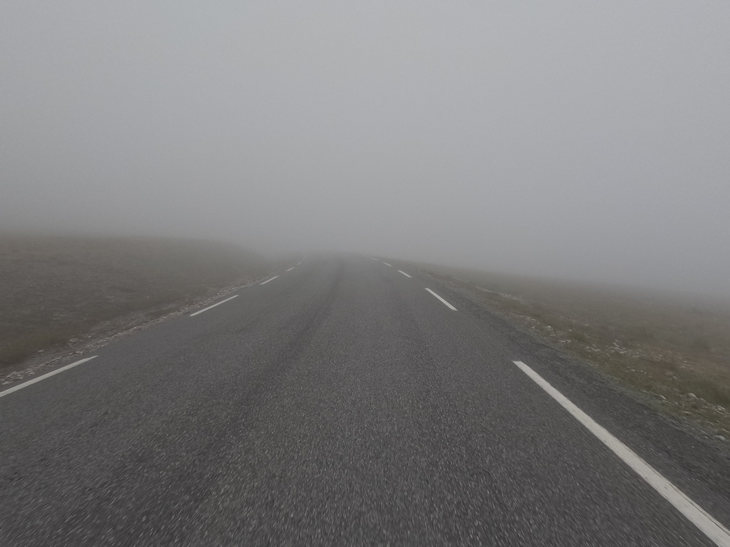 Da hatte ich allerdings die Rechnung ohne den Wirt gemacht, denn nicht nur hatte sich komoot mal wieder einen Schabernack erlaubt, der darin bestand einen kaum als solchen auszumachenden Trampelpfad als Rennradstrecke auszuweisen. Das Resultat war ein um 17 km verlängertes Restprogramm! Unterschätzt hatte ich zudem das anspruchsvolle Profil, dass auf den letzten 30 km zu absolvieren war. Zunächst ging es einen steilen Berg 300 m hinauf und etwa ab der Hälfte steckte ich tief in einer dichten Wolkenschicht. Die Fernsicht lag bei etwa 20 m und die Luftfeuchtigkeit hatte endgültig 100 % erreicht. „So leicht kommst du mir nicht davon, Freundchen“, meldete sich der Nordwind auf dem Pass zurück, der offenbar gerade eine Imageberatung bei Väterchen Frost in Anspruch genommen hatte.