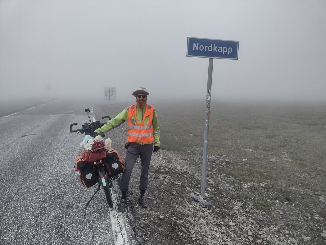 Auf dem Weg hinab tauchte ich noch einmal unter der Wolkendecke durch, nur um beim nächsten Aufstieg gleich wieder in ihr zu verschwinden. Der zweite Aufstieg war noch deutlich härter als der erste und ich musste mir eingestehen, dass ich diese Episode der Reise unterschätzt hatte. Natürlich war ich weit davon entfernt an meine Leistungsgrenze zu gelangen, aber die Kombination aus der strammen Tagesdurchschnittsleistung seit dem Aufbruch in Neu Planig, dem aktuellen Wetter und dem markanten Geländeprofil auf den letzten Kilometern, stellte zumindest eine ernstzunehmende Herausforderung dar. Und noch immer war ich nicht angekommen, noch einmal ging es ein Stück bergab und dann wieder hinauf, bis sich endlich ein Straßenschild mit der Aufschrift „Nordkapp“ aus dem Nebel schälte. Angekommen!