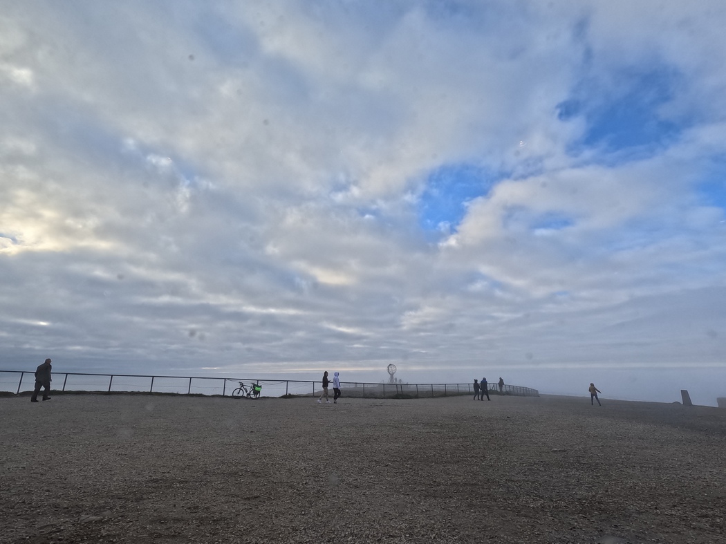 Ich stapfte also durch den Nebel, vorbei an den unzähligen Wohnmobilen, in denen sich überwiegend nichts regte, zum Touristenkomplex. Ich war mir nicht sicher, ob es in Norwegen wie in Finnland üblich war, in der Gastronomie im Voraus zu bezahlen, da mich aber am Empfangstresen niemand behelligte, beschloss ich erst einmal hineinzugehen und das Angebot in Augenschein zu nehmen. Es konnte seinem ihm vorauseilenden Ruf gerecht werden und so labte ich mich eine Stunde an Speis’ und Trank und WLAN. Als ich aufzubrechen gedachte, es war inzwischen ca. 8 Uhr, war ich der einzige Gast und sowohl aus dem Restaurant, als auch dem Empfangsschalter war das Personal spurlos verschwunden. Ich irrte noch eine Weile von hier nach dort, rief ein paar mal „Hallo?“ und entschied dann „na dann halt Pech gehabt!“. Da ich kein Bargeld bei mir hatte, was in Norwegen natürlich auch überhaupt nicht üblich ist, konnte ich meine Schuld auch nicht durch das einstmals nicht unübliche „Auf-dem-Tisch-liegen-lassen“ begleichen und machte mich schließlich wohlgenährt und mit latent schlechtem Gewissen vom Acker.
