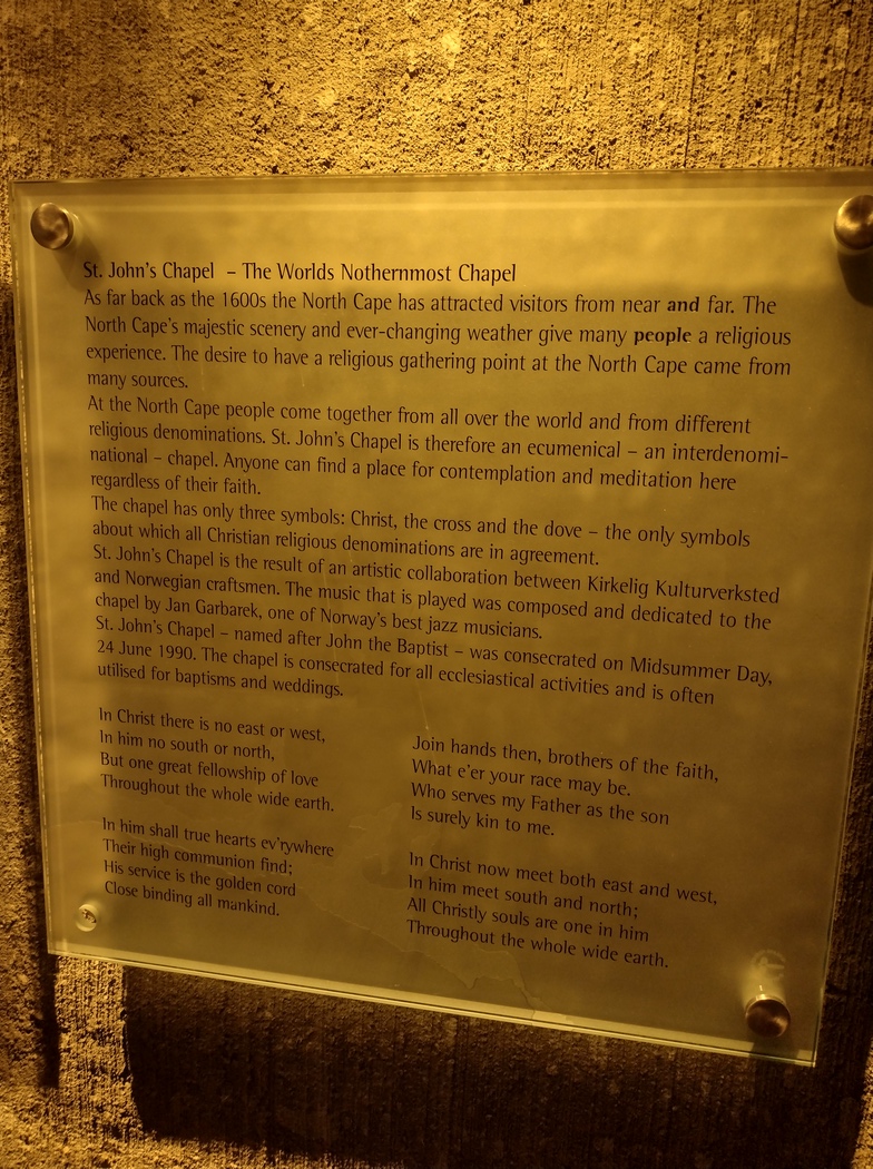 Trotz seiner enormen Größe, wurde es jedoch in dem mehrstöckigen Touristenkomplex bald ziemlich kuschelig, da es kaum jemand länger als 2 Minuten draußen aushielt. Meinen Plan mir eine Möhrensuppe zu kochen, gab ich schließlich auf und begnügte mich stattdessen mit kalter Küche, die ich mir in zwei aufeinander folgenden Aufführungen des Nordkappfilms im unterirdischen Kino einverleibte. Als ich es wieder verließ stellten 3 junge Erwachsene im Vorbeigehen fest: „Der hat ’nen geilen Style!“, „Ja, feier ich!“ und ich wunderte mich, dass die wohl noch nicht gemerkt hatten, dass hier 80 % bis 90 % Deutsche unterwegs waren. Oder sie waren einfach charmante Menschen, denen es Freude machte, Fremden ein Lächeln aufs Gesicht zu zaubern.