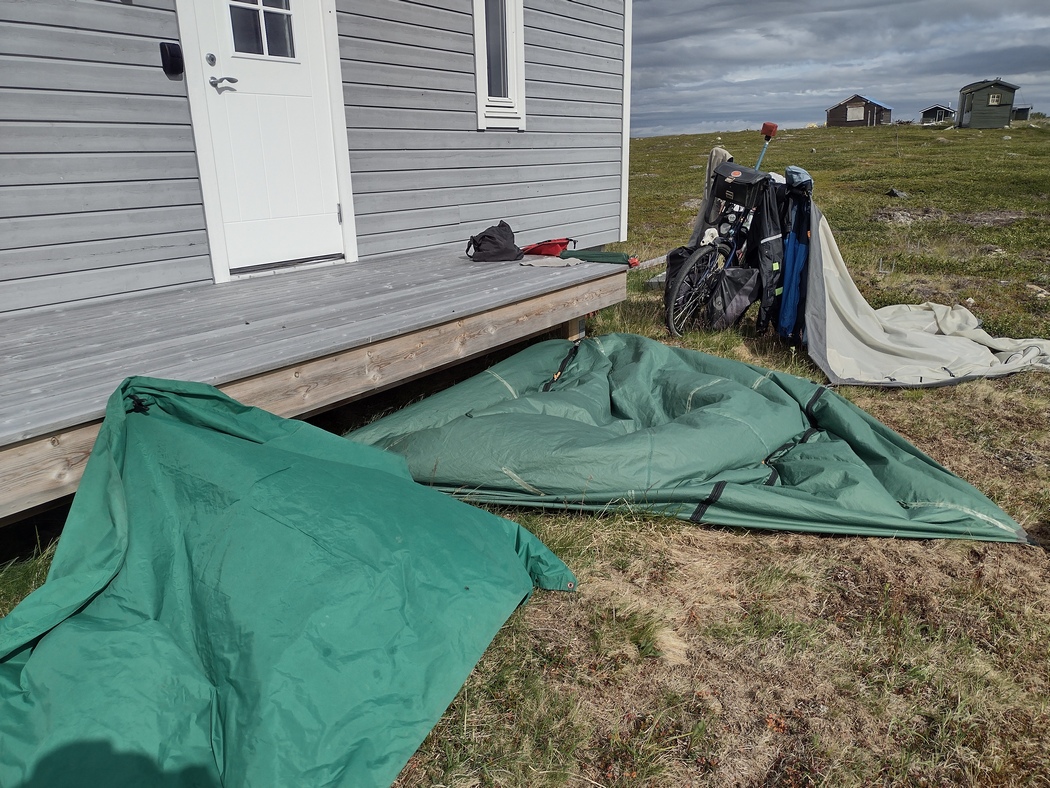 Wäre ich doch früher aufgestanden, dann wäre das Zelt jetzt nicht nass! Naja, andererseits hätte ich dann wohl im Regen frühstücken müssen. Ein Elend ist das! Wie schon am Vortag wurde es aber im Laufe des Tages freundlich genug, dass ich das Zelt bei einer Pause auf der Veranda einer verlassenen Sami-Hütte trocknen konnte. Ich war inzwischen am höchsten Punkt der Hochebene zwischen Olderfjorden nach Alta angekommen und genoss die Aussicht trotz der kräftigen Brise. Auf dem Weg hier herauf war ich an den beeindruckenden Wassermassen des Repparfjordalen vorbei gekommen und hatte Radfahrerinnen um Radfahrer gegrüßt, die mir entgegenkamen. Nie zuvor auf der Reise waren mir so viele (zumindest im Hinblick auf Reisemittelwahl) Gleichgesinnte begegnet.