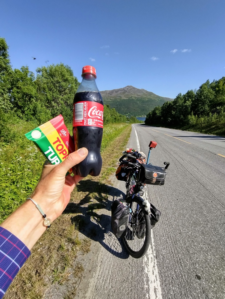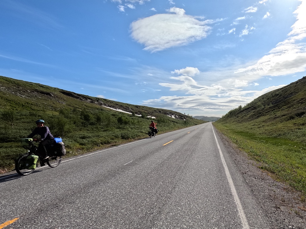 Das sich mir beim Folgen der Küste bietende Panorama war nun endgültig dermaßen bezaubernd, dass ich mich in fortwährender Entzückung befand. Slatibartfast hatte seinen Preis definitiv mehr als verdient und ich fragte mich wieso er eigentlich nicht noch 41 weitere erhalten hatte. Um 10 Uhr knackte ich dann an einem verhältnismäßig unspektakulären Abschnitt die 25.000 km Marke, schoss aber trotzdem gewissenhaft eben dort das Triumphfoto. Wir hatten das schon bei Kilometer 5.000, 10.000, 15.000 und 20.000 so gemacht, was ehrlich gesagt ziemlicher Unsinn war, da unsere Zählmethode durch das GPS-Tracking ja ohnehin nicht kilometerscharf ist. Vielleicht hätten wir es halten sollen, wie die anderen Radreisenden, die nach ihrem Instagram-Accounts zu schließen ihre runden Kilometermarken immer an besonderen Sehenswürdigkeiten zu knacken scheinen. Apropos andere Radreisende: Eine weitere bemerkenswerte Begegnung ereignete sich an diesem Tag als ich Claudia und Erik vor einer Tunnel-Umfahrung warnte, die in einer erodierten Straße endete. Ich war selbst gewarnt worden und musste die Erfahrung nicht selber machen. Gut, dass ich mich dazu entschieden hatte die Warnung weiterzutragen, denn so blieben wir in Kontakt und sollten uns Wochen später in Hamburg wieder treffen.