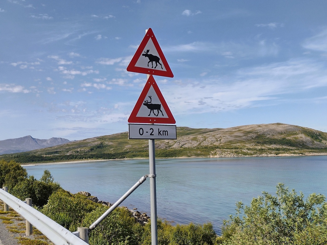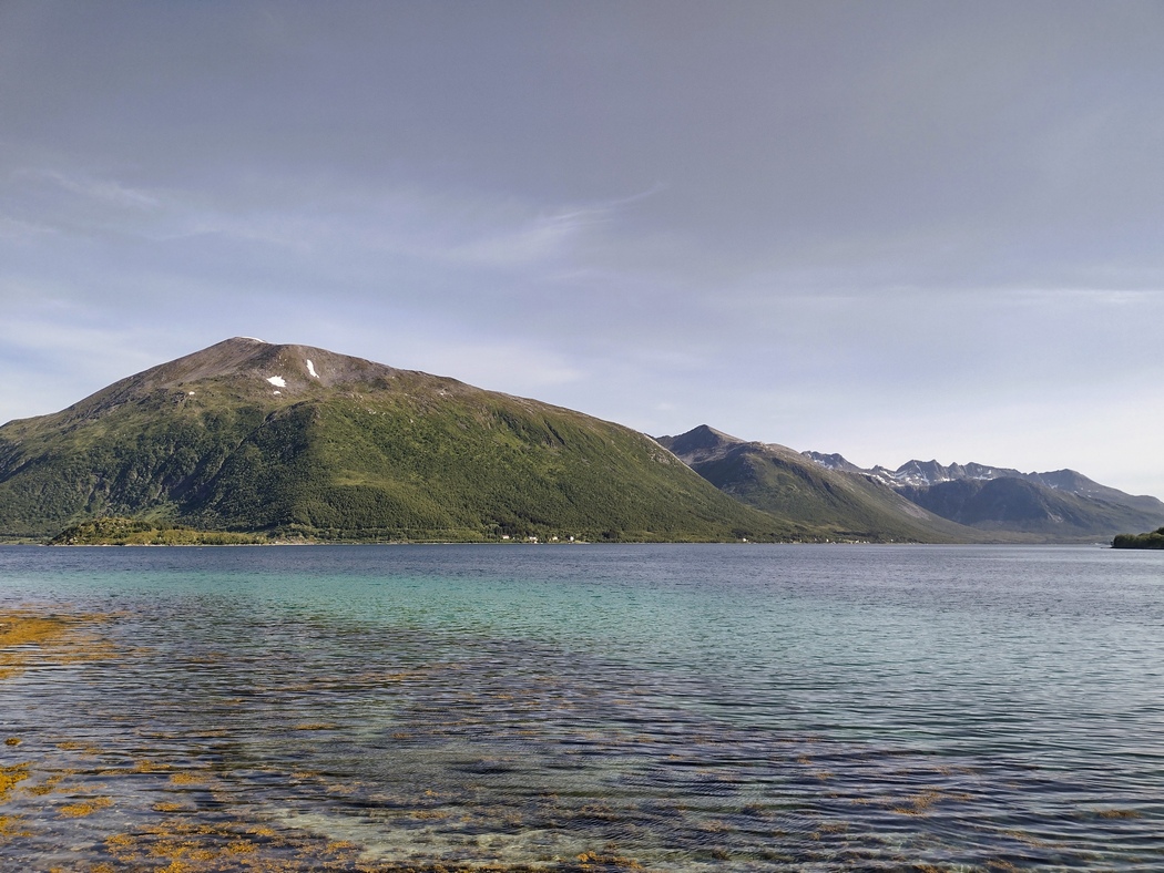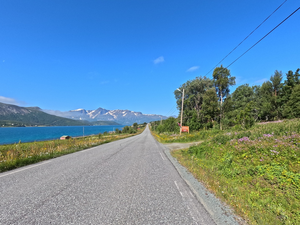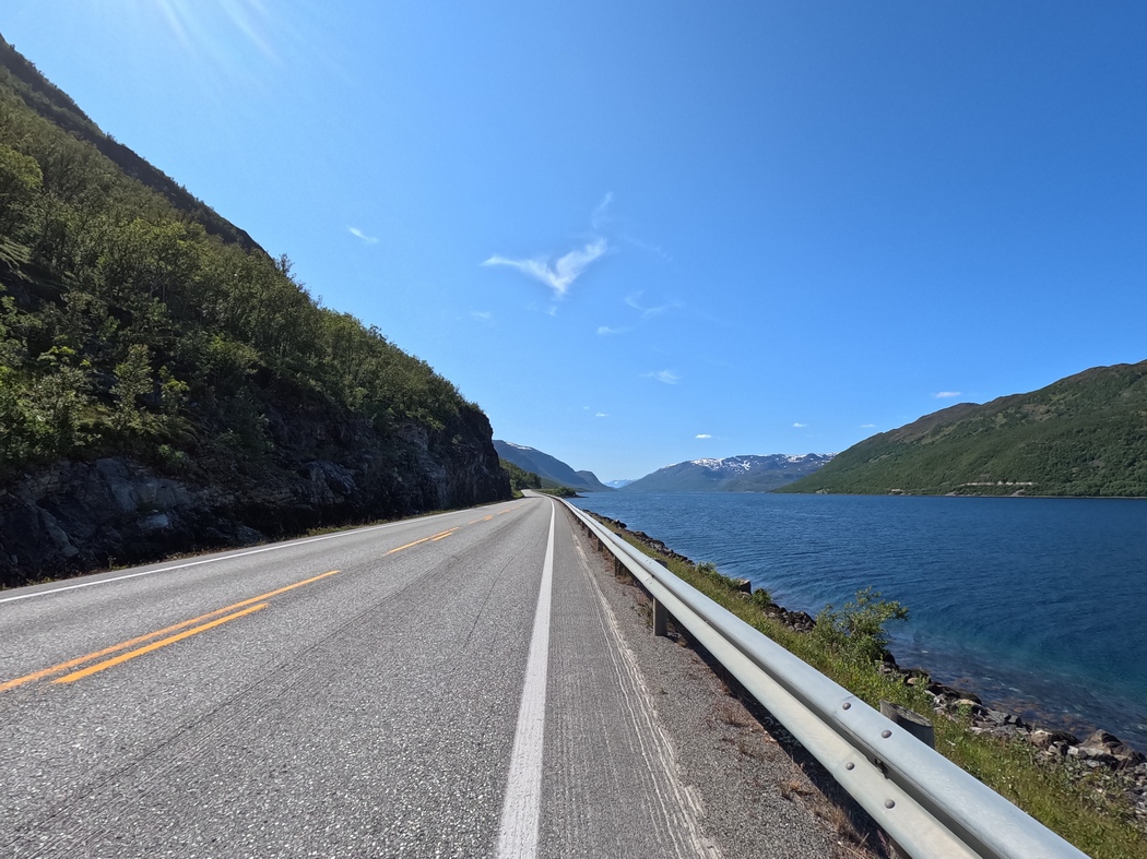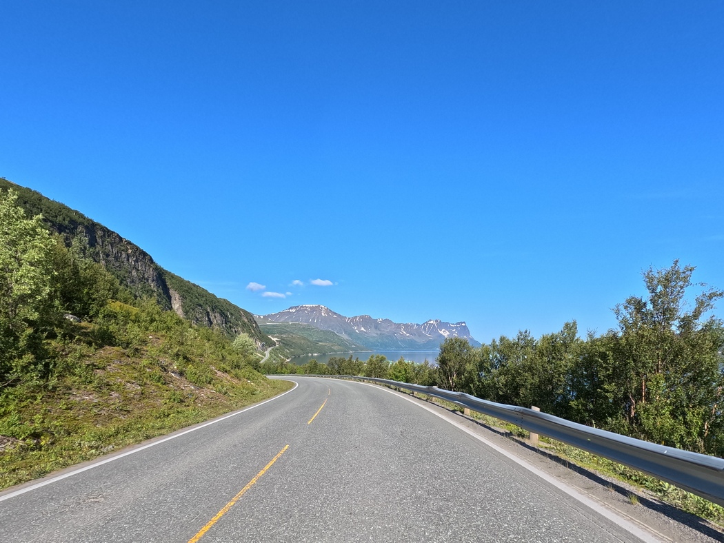 Die Wolken hingen wieder tief an diesem Morgen, aber während der 13 km langen Überfahrt und auch im Anschluss blieb Regen aus, während der Himmel immer weiter aufklarte. In Lyngseidet angekommen, wollte ich eigentlich der 868 in Richtung Süden folgen, stellte jedoch fest, dass ich alternativ auch weiterfahren konnte nach Svensby, von wo eine weitere Fähre nach Breivikeidet fuhr. Von dort wiederum ließ sich Tromsø mit dem Fahrrad erreichen, von wo eine Brücke auf die Insel Kvaløya führte.