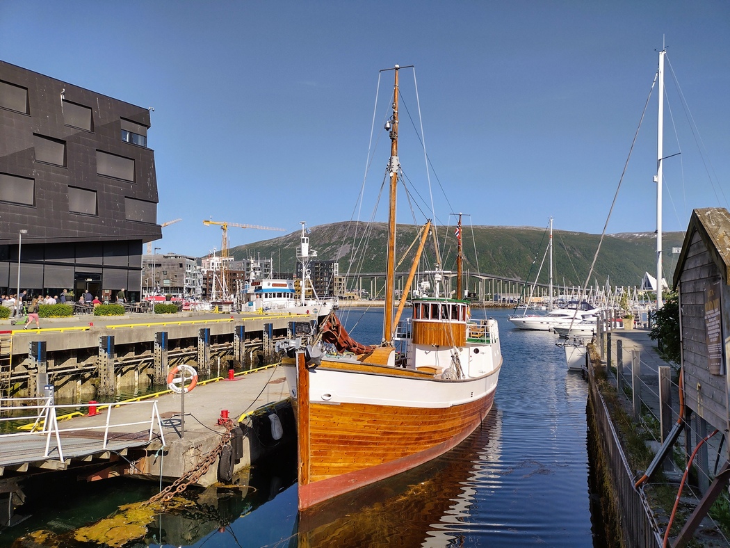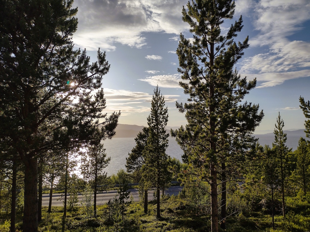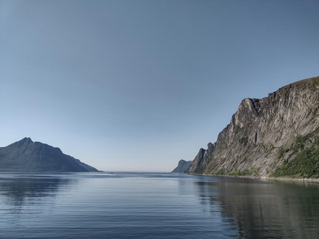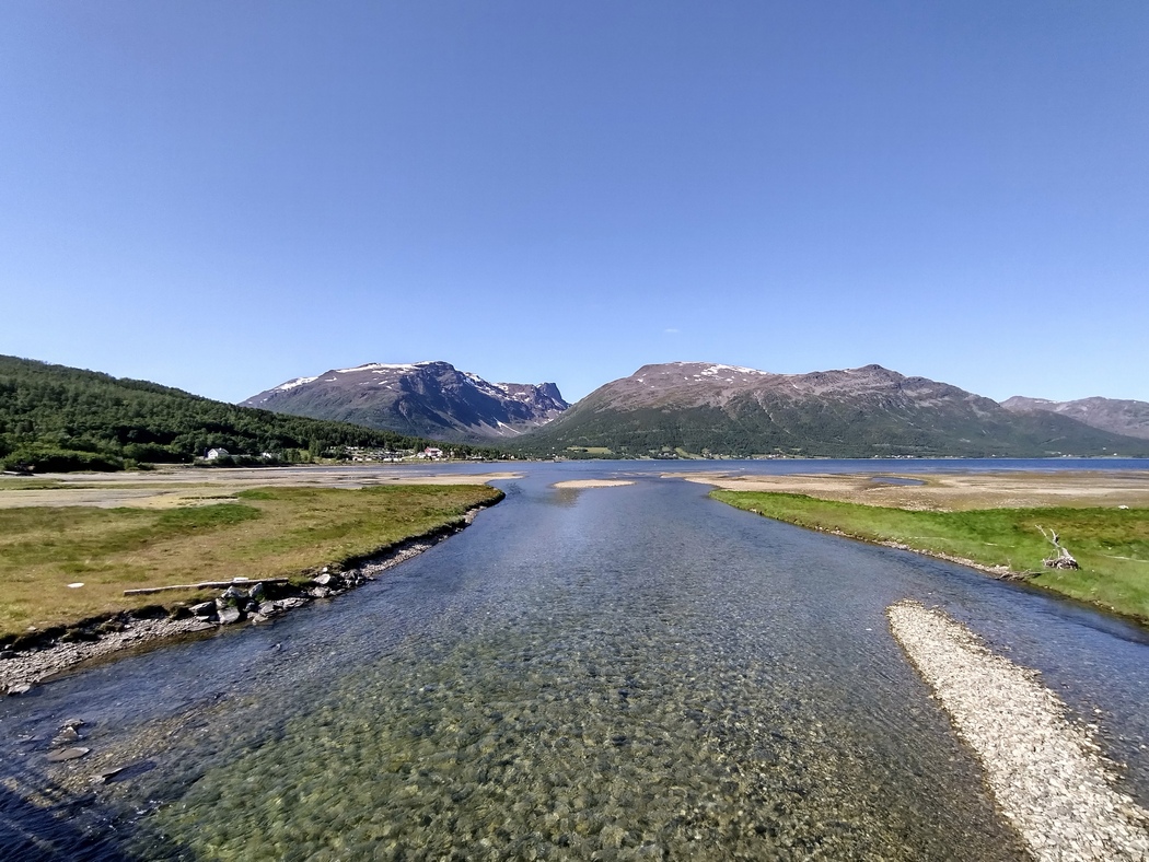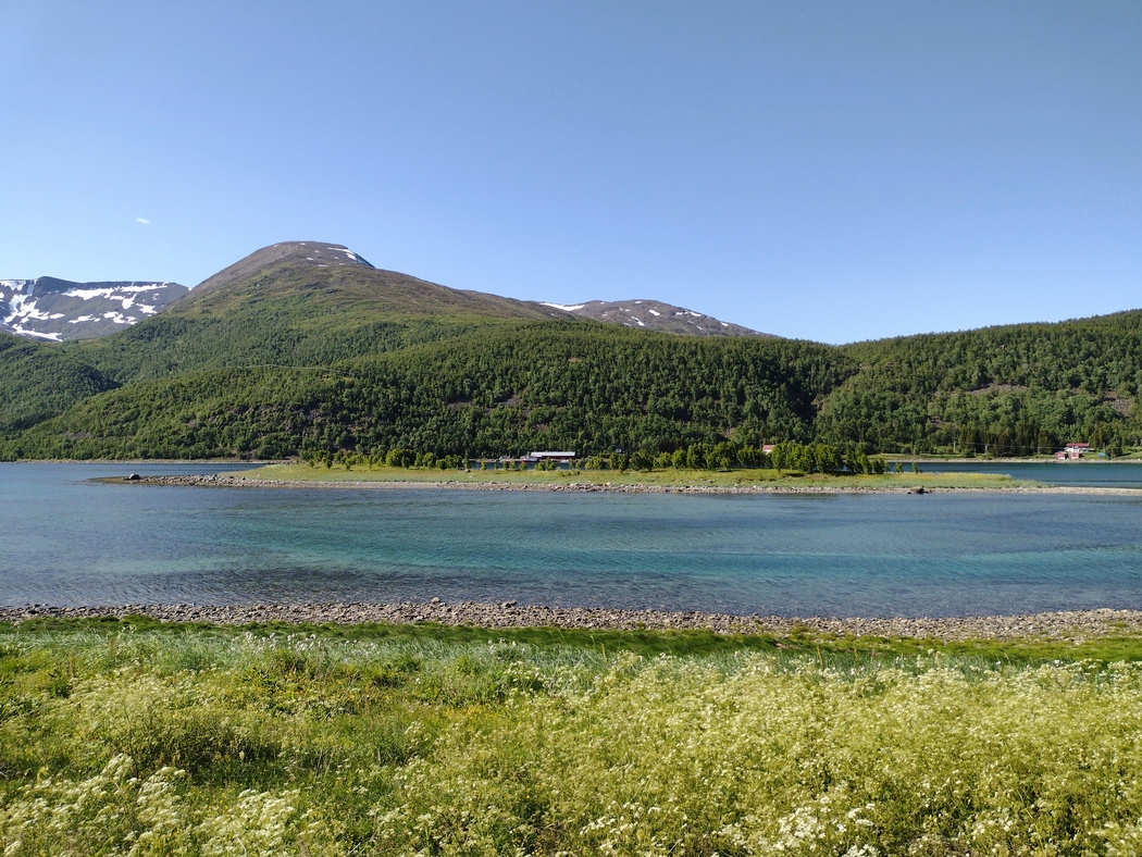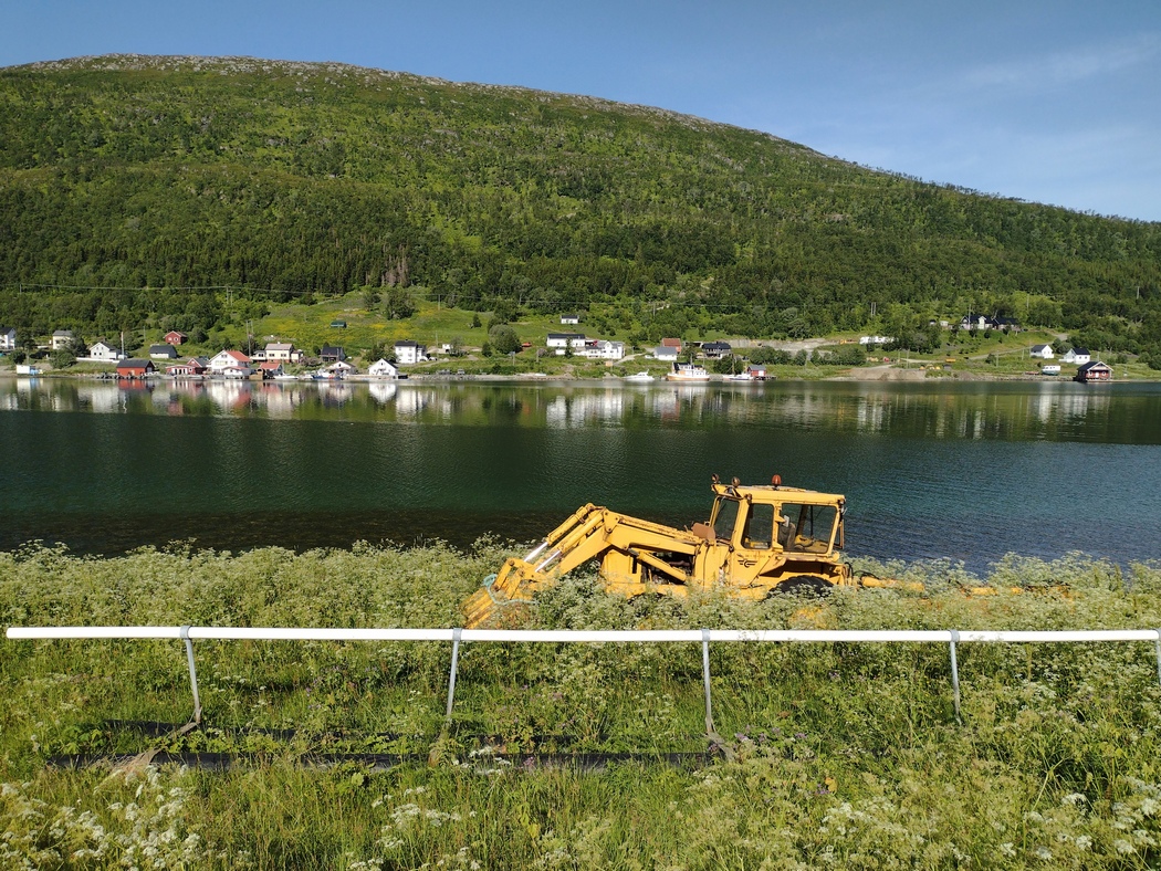 Die Wolken hingen wieder tief an diesem Morgen, aber während der 13 km langen Überfahrt und auch im Anschluss blieb Regen aus, während der Himmel immer weiter aufklarte. In Lyngseidet angekommen, wollte ich eigentlich der 868 in Richtung Süden folgen, stellte jedoch fest, dass ich alternativ auch weiterfahren konnte nach Svensby, von wo eine weitere Fähre nach Breivikeidet fuhr. Von dort wiederum ließ sich Tromsø mit dem Fahrrad erreichen, von wo eine Brücke auf die Insel Kvaløya führte.