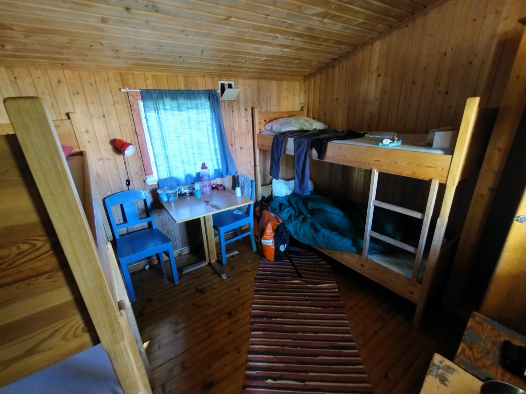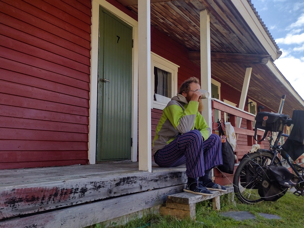 Abends erreichte ich das Dörfchen Olderdalen, dass ich mir auch als Tagesziel gesetzt hatte, da iOverlander dort ein Bett in einem Hütten-Dorm für 100 Norwegische Kronen, also knapp 9 Euro in Aussicht gestellt hatte. Dieser Preis war ja kaum zu glauben! Als ich am Standort angekommen war, entdeckte ich dort lediglich ein frühstücksbrettgroßes Hinweisschild, das tatsächlich auf „cabin 100 nok“ hinwies. Dem gegenüber auf einer Bank vor sich hin träumende Nautiker mit Berufserfahrung auf einer deutschen Helgoland-Fähre konnte ich die Information entlocken, wo ich jemanden finden konnte, der mir auch Einlass gewährte. Wobei, da alle Hütten offen standen, ich das im Notfall auch alleine geschafft hätte.