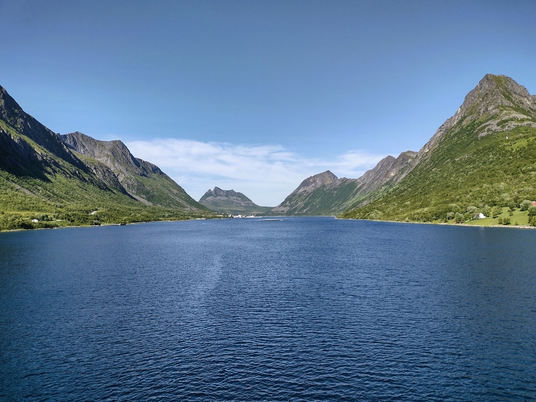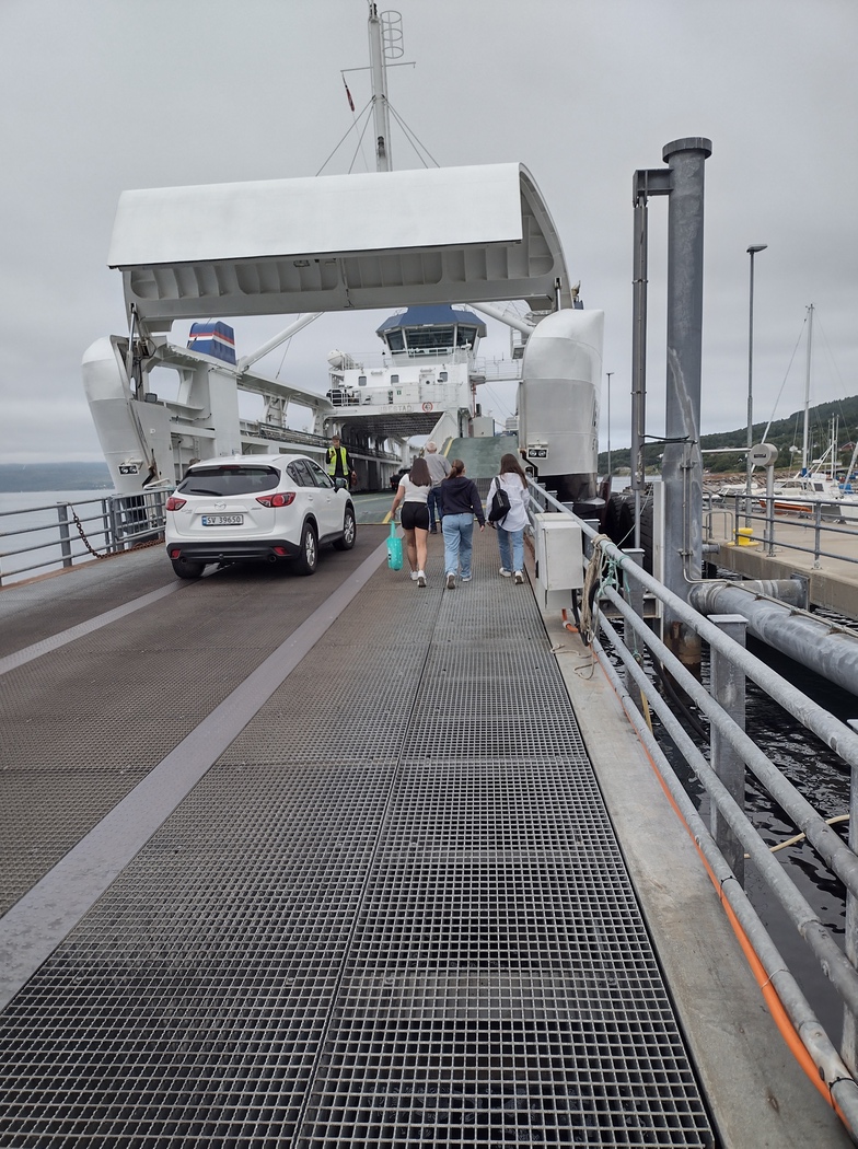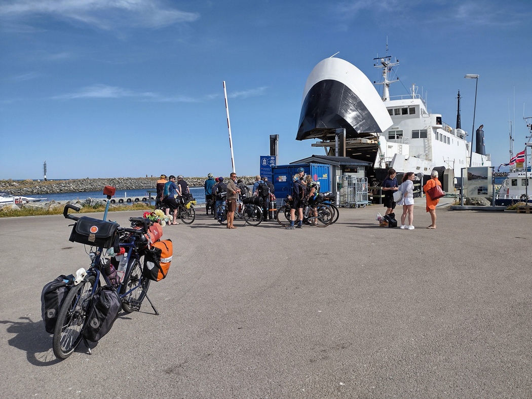 Den Pausetag hatte ich unter anderem damit verbracht, zu überlegen, wie ich nun weiterfahren wollte und hatte festgestellt, dass ich mich direkt neben dem kleinen Hafen mit der Fähre nach Lyngseidet befand. Egal wie es von Lyngseidet weiter gehen würde, wollte ich mir diesen kleinen Luxus gönnen und stand am 10. Juli pünktlich um 8:15 Uhr am Hafen, um an Deck zu rollen. Der Transport von Fußgänger*innen und Fahrrädern ist auf allen Fähren kostenlos, da es der norwegischen Regierung daran gelegen ist, umweltfreundliche Transportmittel zu fördern. Der Anteil von Elektro-Pkw an der Gesamtflotte liegt übrigens bereits bei 15% (im Vergleich Deutschland: 3,9%), was man an den vielen Teslas, die auf den Straßen unterwegs waren, auch signifikant wahrnehmen konnte. Die Fähre selbst war übrigens ebenfalls elektrisch betrieben.