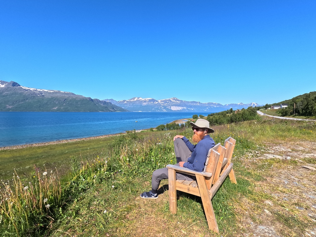 Da das Gespräch sehr einseitig durch mich am Leben gehalten werden musste, begann ich irgendwann einfach weiter an unserem Blog zu arbeiten, während wir auf die Fähre warteten. Da wir bei der Überfahrt genauso weiter verfuhren, war mein Gefühl, dass sich unsere Beziehung meinem Empfinden nach soweit abgekühlt hatte, dass es nun selbstverständlich erschien, wenn jeder seiner Wege gehen würde, auch wenn wir beide in Richtung Tromsø unterwegs waren.