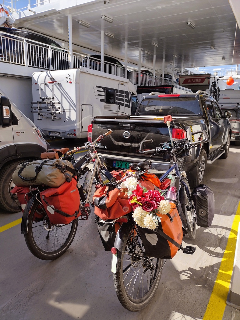Wie angenehm es war, dass man als Radfahrer immer an den endlosen Kraftwagen-Schlangen vor den Fähren vorbei fahren durfte. Das wurde ja nicht nur geduldet, sondern erbeten, damit man zügig unter Deck verschwinden und sein Fahrrad sicher in den dafür vorgesehenen Bereichen abstellen konnte.