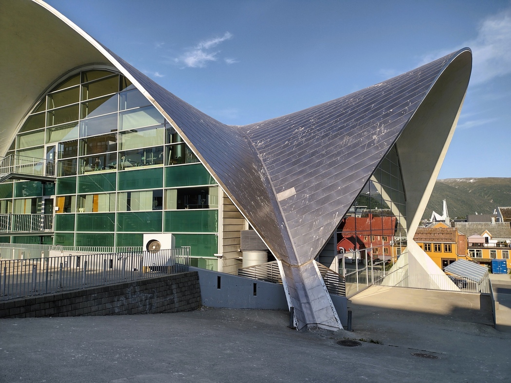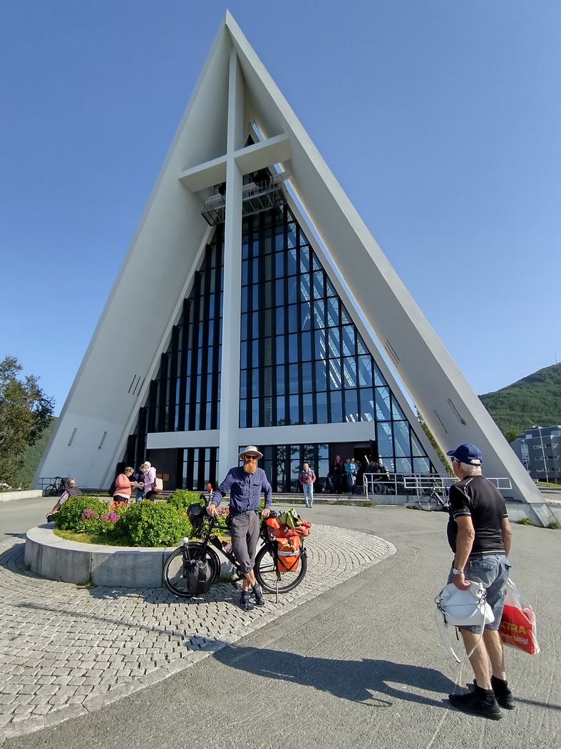 Wer annimmt, dass ich mich nun wegen anhaltendem Nordwind mit Rückenwind fortbewegen konnte, der täuscht. Erstens fuhr ich ja überwiegend gen Westen und zweitens hatte der Wind inzwischen gedreht und kam natürlich aus Westen. So erreichte ich Alta relativ spät und da das städtische Schwimmbad bereits um fünf geschlossen hatte und mir die einzige Couchsurferin der Stadt wegen Krankheit eine Abfuhr erteilt hatte, musste ich einen weiteren Tag ohne Dusche auskommen. Das dem UNESCO-Welterbe zugehörige Felsenmalerei-Ensemble war ebenfalls bereits geschlossen und so beließ ich es dabei, mir die futuristische Polarlicht-Kathedrale von außen anzuschauen und Alta noch am Abend hinter mir zu lassen.