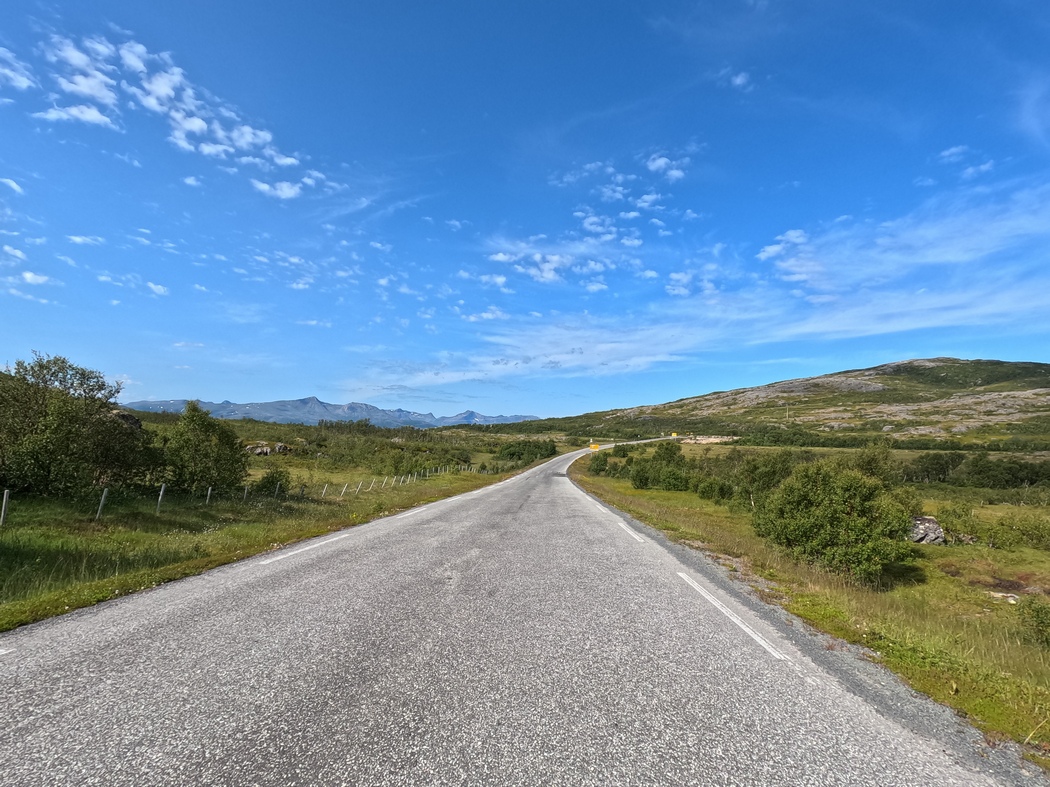 Die nun folgende Überfahrt war ganze 40 km weit und damit die längste meines gesamten norwegischen Insel-Hoppings. Ab meiner Ankunft auf Andøya ging es nun bis auf weiteres ziemlich straight nach Süden. Und was meint ihr was inzwischen passiert war? Richtig, der Wind hatte gedreht und kam jetzt aus Richtung Süden.