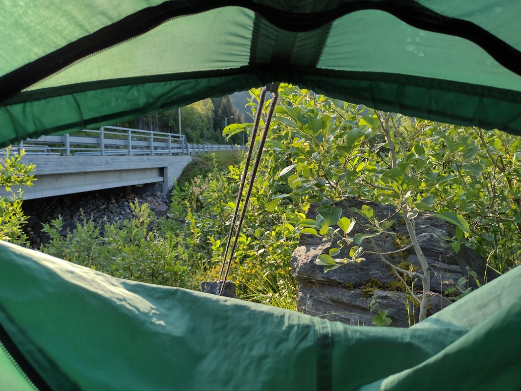 Aufgrund des oben beschriebenen peinlichen Zwischenfalls und anschließender Entscheidungsschwierigkeiten, war nicht mehr daran zu denken, die letzte Fähre nach Andenes noch zu erreichen. Nachdem ich durch etwa 25 Tunnel in teils prekärem Zustand einen Großteil der Strecke hinter mich gebracht hatte, wählte ich daher einen mittelmäßigen Platz nahe der Straße, an dem aber wenigstens eine Bank-Tisch-Kombination für eine bisschen Komfort sorgte. Exakt als ich mit allen Vorbereitungen auf die Nachtruhe fertig war, brach ziemlich unvermittelt (Ok, eigentlich hatten es die Wolken verraten, aber ich wollte es nicht wahrhaben) ein stürmisches Gewitter über mir zusammen. Als ich daraufhin zusah schleunigst im Zelt zu verschwinden, sah ich noch eine Gruppe von sechs Radreisenden aus Richtung Gryllefjord heranrasen und hastig ihre Zelte auf der Wiese unterhalb meines Lagerplatzes aufbauen. Diesmal war das Glück mir hold gewesen.