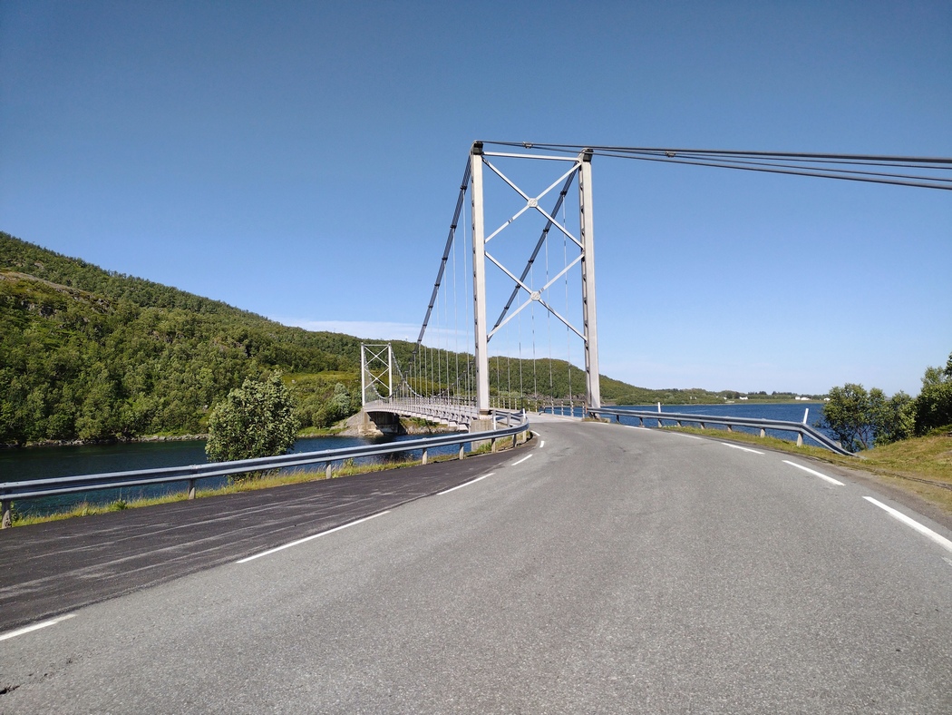 Die mächtige Brücke nach Kvalöya verfügte zwar über eine Fahrradspur, diese war aber kaum breiter als 1,5 m und da ein ordentlicher Wind pfiff, mit dem ich meine liebe Mühe hatte, wurden die zahlreichen Situationen mit Gegenverkehr zu echten Zitterpartien.
