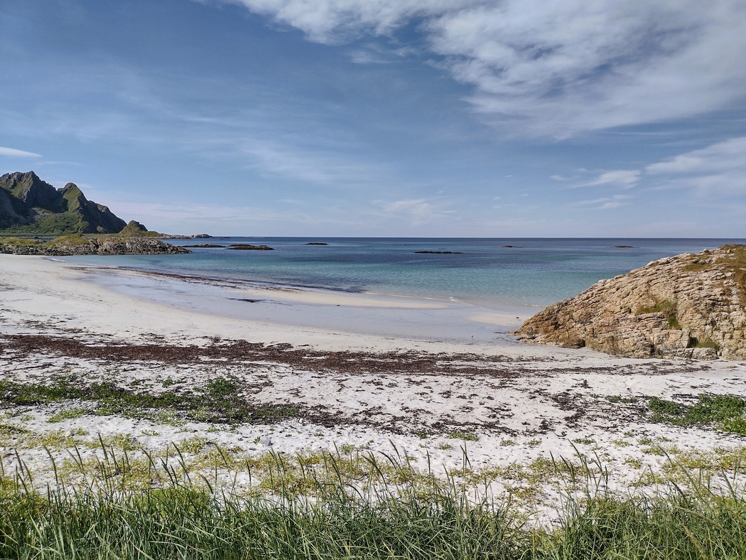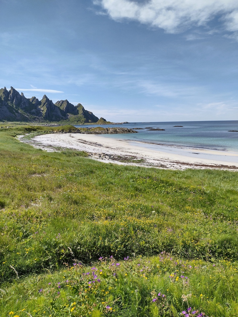 Bevor mir das so richtig zu schaffen machte, erlebte ich aber noch einmal eine Steigerung in Sachen schöner Natur. Es kamen an Andøyas Nordküste jetzt noch weiße Strände zu den Bergen, der pflanzlichen Farbenpracht und dem lupenreinen türkisen oder tief blauen Wasser hinzu. Nicht zum ersten mal staunte ich über die üppige Vegetation und die wundervolle Pracht an Blüten, die sich in dem kurzen nordischen Sommer in Rekordzeit entwickeln mussten. Zweifelsohne half ihr dabei natürlich die kaum endende Sonneneinstrahlung rund um die Uhr.