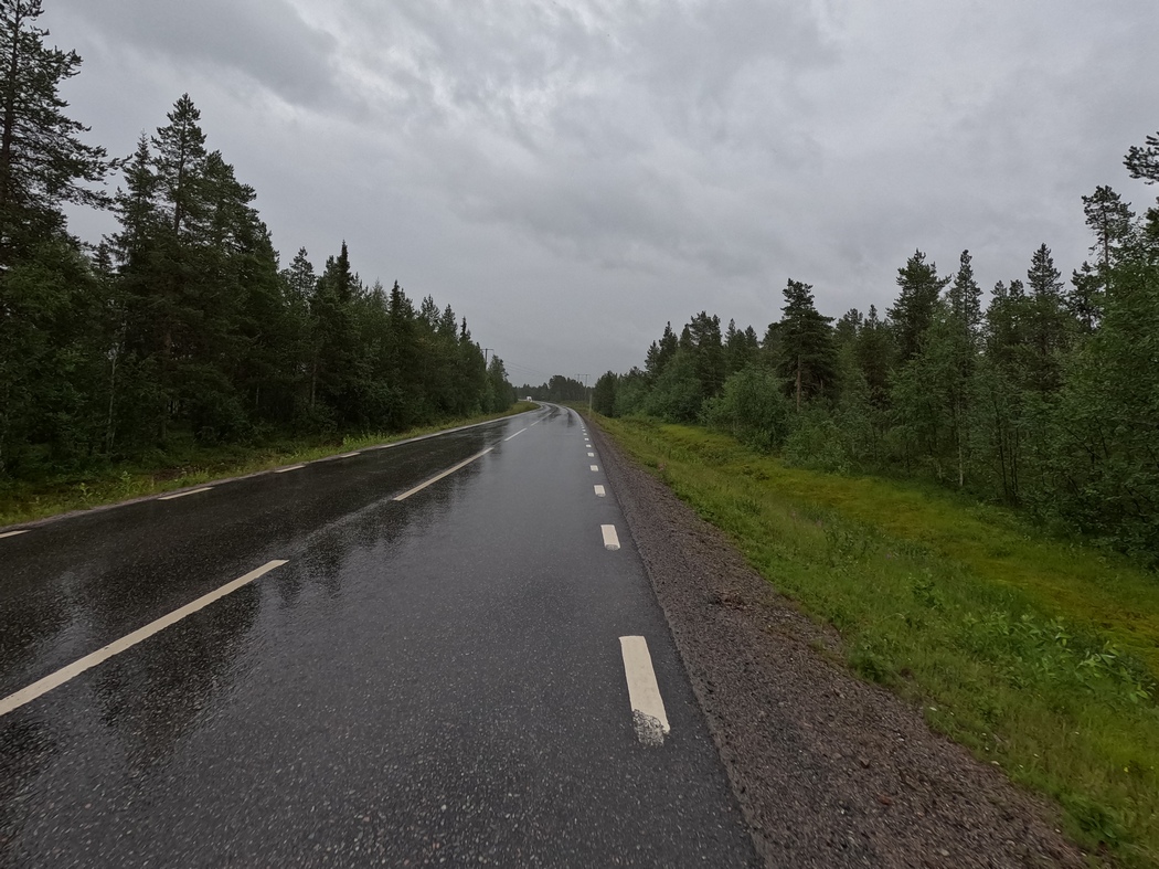 Jetzt legte auch der Wind noch einmal eine Schippe drauf und mir wurde langsam klar, dass es jetzt zunehmend unrealistischer wurde Adak zu erreichen. Das Problem war nur, wo ich sonst bleiben sollte. Das Zelt aufzuschlagen erschien mir bei diesen Bedingungen zu ungemütlich bzw. unrealistisch oder fahrlässig. Wie gesagt, der schwedische Norden ist viel dünner besiedelt als jener seiner Nachbarländer und so schien es kaum eine Möglichkeit zu geben irgendwo unterzukommen. Es sah schwer danach aus, dass ich, wenn es so weiter ginge, das Zelt eben doch irgendwo im Wald versuchen musste aufzubauen. Zwar gab es weder Hütten noch Ortschaften, dennoch herrschte durchaus etwas Verkehr. Obwohl das Wetter jetzt wirklich markant war und getrost von einem ernstzunehmenden Unwetter die Rede sein konnte, hielt es offenbar niemand der Fahrer*innen für erforderlich einmal anzuhalten, um sich nach meinem Wohlbefinden zu erkundigen. Hätte ich aktiv versucht jemanden anzuhalten, wäre das sicher gelungen. Dennoch musste ich an den Orient denken, wo es unmöglich erschien, dass in dieser Situation niemand gehalten hätte. So langsam kamen leichte Existenzängste in mir auf. Was machst du, wenn das so weitergeht? Was machst du, wenn das Zelt dem Wind nicht standhält?