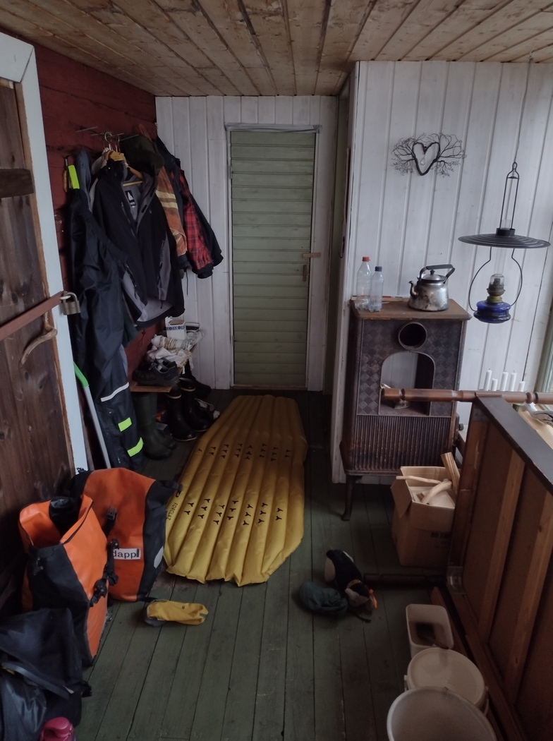 Es wurde Zeit noch einmal anzuhalten, um auszutreten. Ich stellte das Rad also in einer geschotterten Haltebucht ab und ging ein paar Schritte auf den Waldrand zu. Dort entdeckte ich einen schmalen Pfad, der weiter in den Wald führte. Gut möglich, dass der zu einer Hütte führte, dachte ich und so war es auch bzw. war es natürlich das traditionelle Sammelsurium von Hütten. Allerdings sah alles ziemlich verschlossen aus, bis auf die Haupthütte! Tatsächlich, die Tür zum Wintergarten klemmte nur, sie war nicht verschlossen. Streng genommen kein Einbruch also. Drinnen war es trocken und der Wind blieb weitestgehend ausgesperrt. Keine lange Diskussion also, der Eigentümer dürfte unter diesen Umständen nichts dagegen haben und selbst wenn, das wäre mir nun herzlich egal gewesen. Aber davon einmal abgesehen, würde bei diesem Wetter an einem Sonntagabend ohnehin niemand seine Sommerhütte aufsuchen, beendete ich meine Gedanken zu dem Thema, als ich wieder an meinem Rad angekommen war. Als ich mir dieses gerade greifen wollte, stellte ich eine etwa 40 cm lange Furche im Schotter fest, die vom hinteren Ständer wegführte. Was zur… da hatte eine Böe doch tatsächlich mein Rad vor sich hergeschoben. Also: Fahrrad geholt und an die Hauswand gelehnt. Eigentlich war es hier ziemlich gemütlich, es hätte schlimmer kommen können. Ganz sorgenfrei ließen mich die sich rund um das Haus biegenden Fichten allerdings nicht. Wie viel die wohl aushielten?