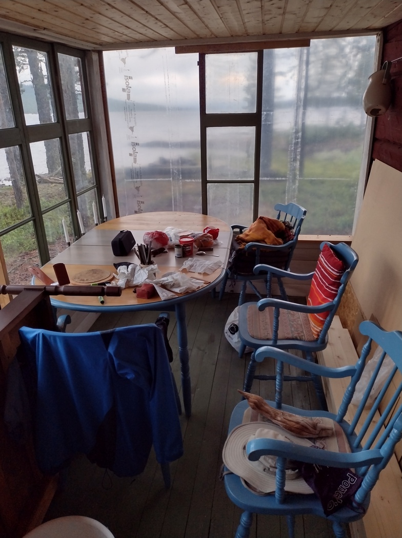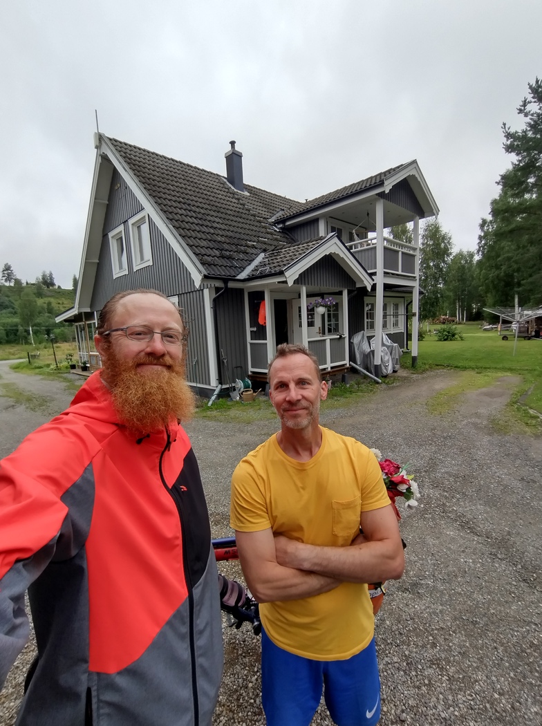 Auf diese Weise kam ich noch viel weiter vorwärts als befürchtet, bis ich schließlich eine Spaziergängerin mit Hund ansprach. Sie wiederum behauptete, dass sie nicht aus dieser Gegend komme und daher auch keine Idee habe. So fuhr ich also wieder weiter und sah nach wenigen hundert Metern einen Mann in der Einfahrt zu seinem Haus, dass von zwei Garagen und mindestens vier Hütten umzingelt war. Wieder versuchte ich mein Glück, aber auch hier bestand offensichtlich kein Interesse daran, einem einigermaßen abgerissen wirkenden Fahrrad-Hausierer, der sich frech-dreist selbst einladen wollte, Obdach zu gewähren und sei es nur in der leeren Garage. Tatsächlich stellte sich meine Not ja auch nicht allzu groß dar, denn das Zelt war nur sehr feucht, nicht jedoch triefend nass. Zudem war es inzwischen aufgeklart und keinesfalls sicher, dass es die Nacht über noch einmal regnen würde. Patrick, ja ich kenne den Namen des Hausherren, was vielleicht schon ein Hinweis auf die weitere Entwicklung der Ereignisse sein könnte, lehnte ab und schlug stattdessen vor, dass ich mein Glück im 10 km entfernten Campingplatz in Långsele, der auch über Hütten verfügte, versuchen sollte. Er wollte immerhin dort für mich anrufen und ging dafür nach ersten Fehlversuchen ins Haus. Dort blieb er so lange bis ich schon vorhatte wieder aufzubrechen. Doch schließlich kam er wieder heraus, um mir einerseits zu erklären, dass er den Campingplatz nicht erreicht habe und andererseits, dass er einen Sinneswandel durchlebt hatte. „We should help each other“, stellte er fest und bot mir an entweder ein (trockenes) Zelt aus eigenen Beständen im Garten aufzubauen oder im Wintergarten zu schlafen.