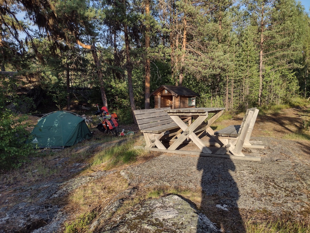 Etwa 15 km vor Sundsval entdeckte ich auf der Karte einen vielversprechenden Spot für eine Übernachtung und wurde nicht enttäuscht. Vor einem Café, das in einem alten Bauernhof untergebracht war, durfte ich mein Zelt auf einer Bühne aufbauen, also überdacht. Darüber hinaus gab es eine Toilette, fließendes Trinkwasser, Tische und Bänke sowie ein offenes städtisches WLAN.