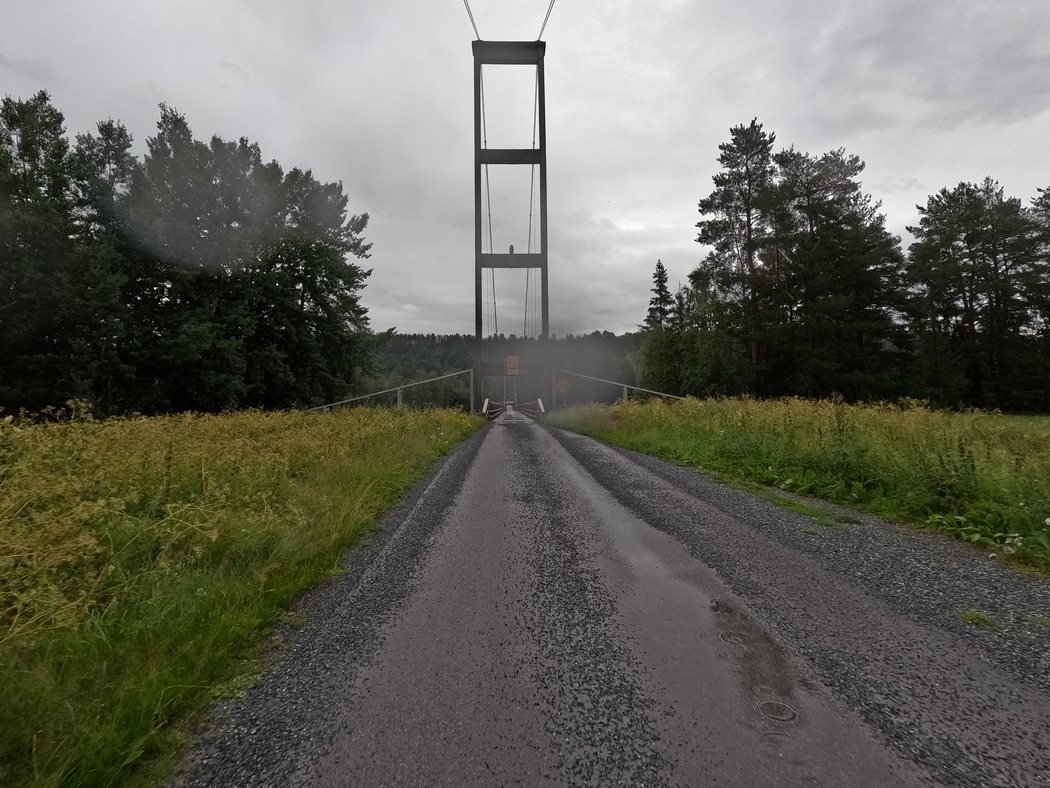 Ich folgte den ganzen Tag dem Lauf des Ångermanälven über die Straße 90, als ich hinter Näsåker mal wieder in einen ernsthafteren Regenschauer geriet, den es unter dem winzigen Sonnenschirm vor einer heruntergekommenen Tankstelle abzuwarten galt. Ich hatte mir fest vorgenommen heute auf keinen Fall draußen zu zelten, zumal Edwin noch nass war, da ich eine Trocknung zur rechten Zeit verpasst hatte.